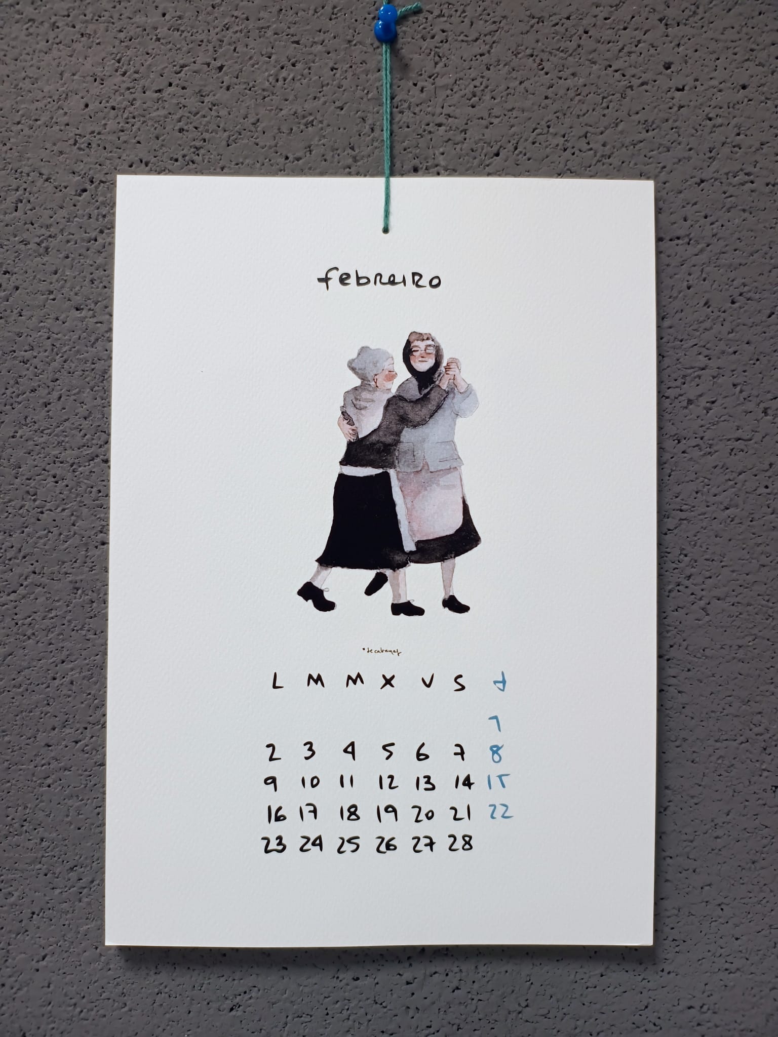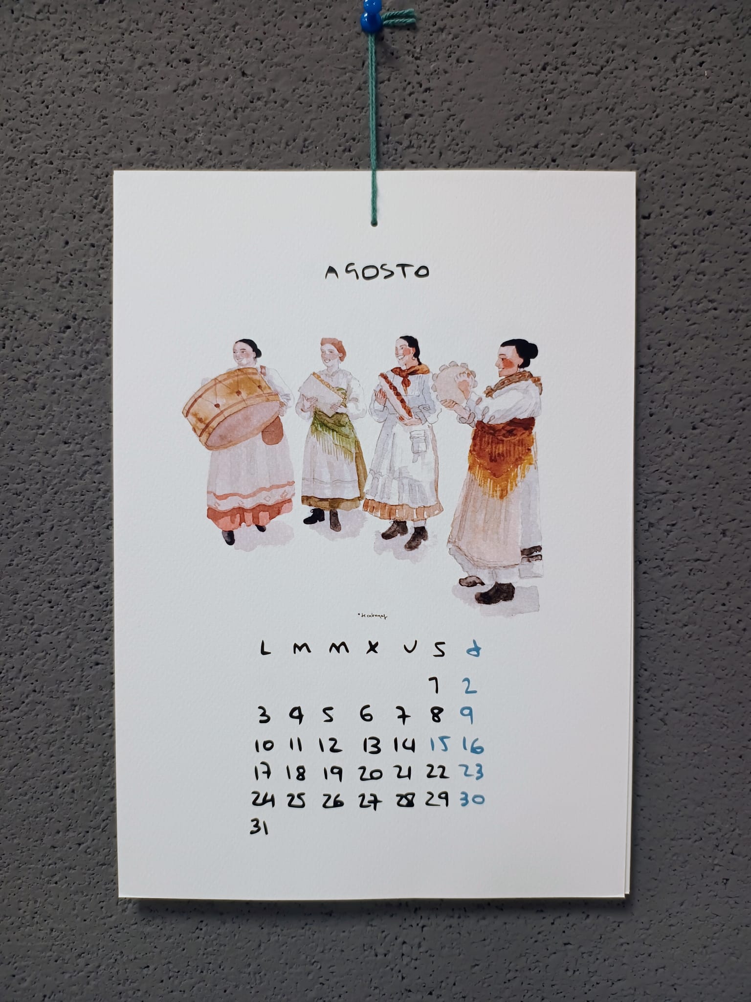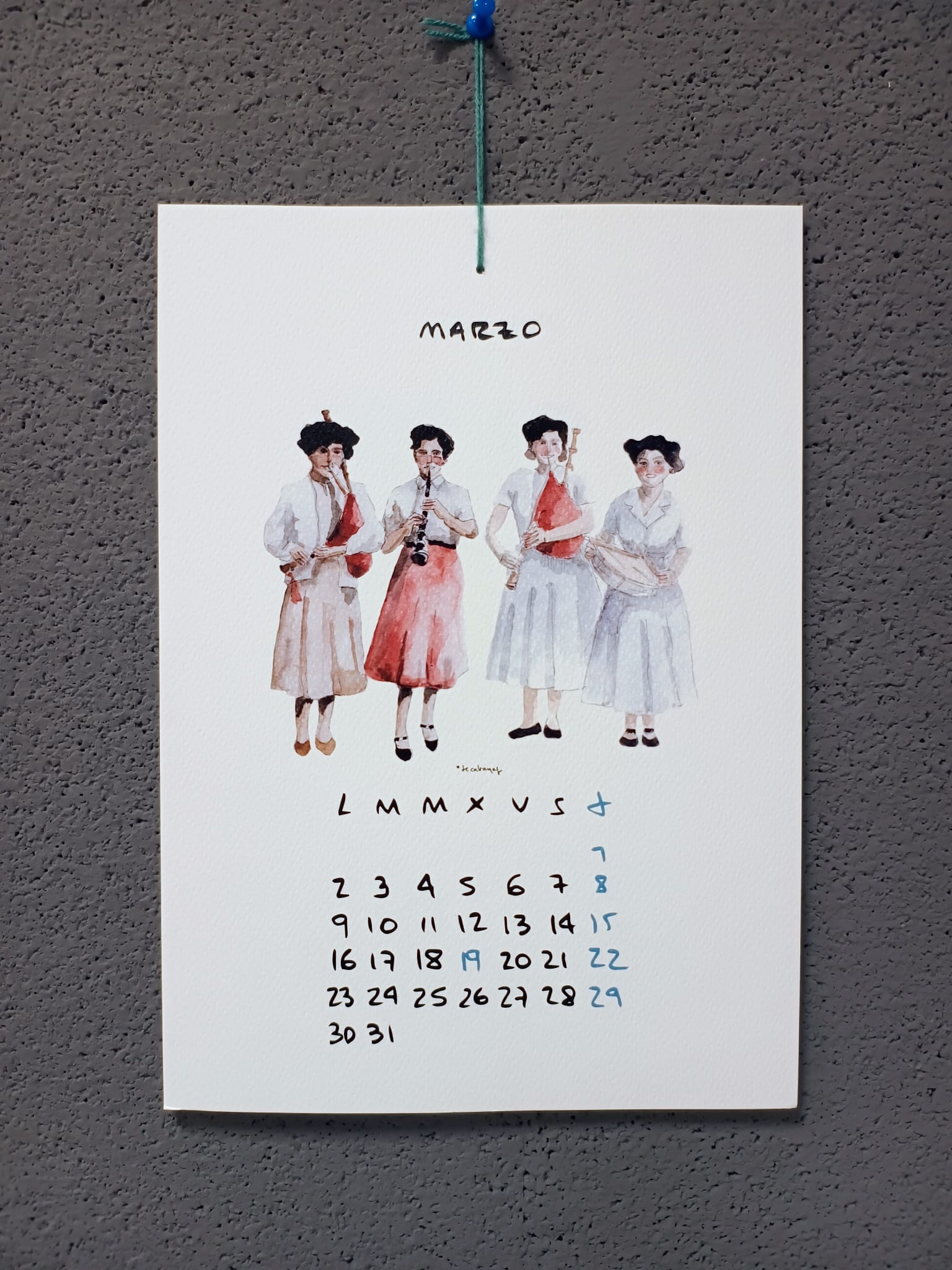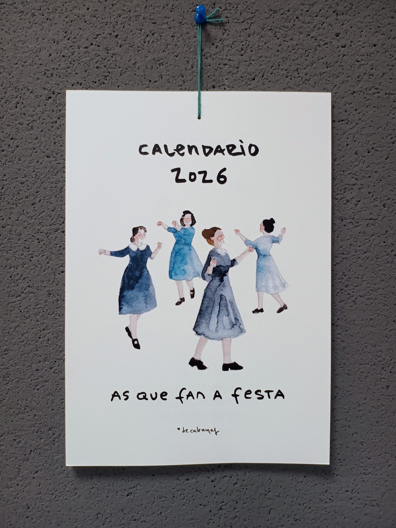 Calendarios “As que fan a festa”, baseado na serie do mesmo nome: Ilustracións de mulleres tocando instrumentos ou bailando para reivindicar e celebrar o papel das mulleres no mundo da música. Pandeireteiras, gaiteiras, percusionistas e bailadoras: gardianas e transmisoras da música tradicional que nos recordan que as mulleres son as que fan a festa.